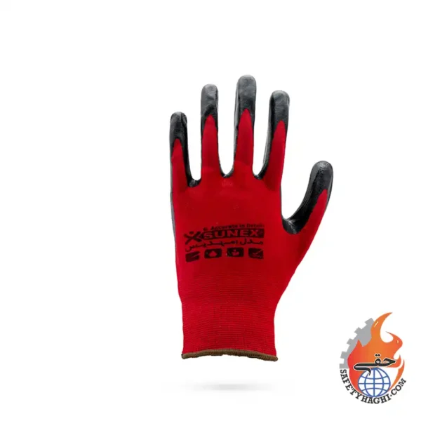 دستکش کف مواد کارگری سانکس ضد مواد نفتی و حلال ها و روغن ها- رنگ قرمز مشکی- با جنس رویه پلی استر- با مقاومت نسبی در برابر پارگی و سوراخ شدن.