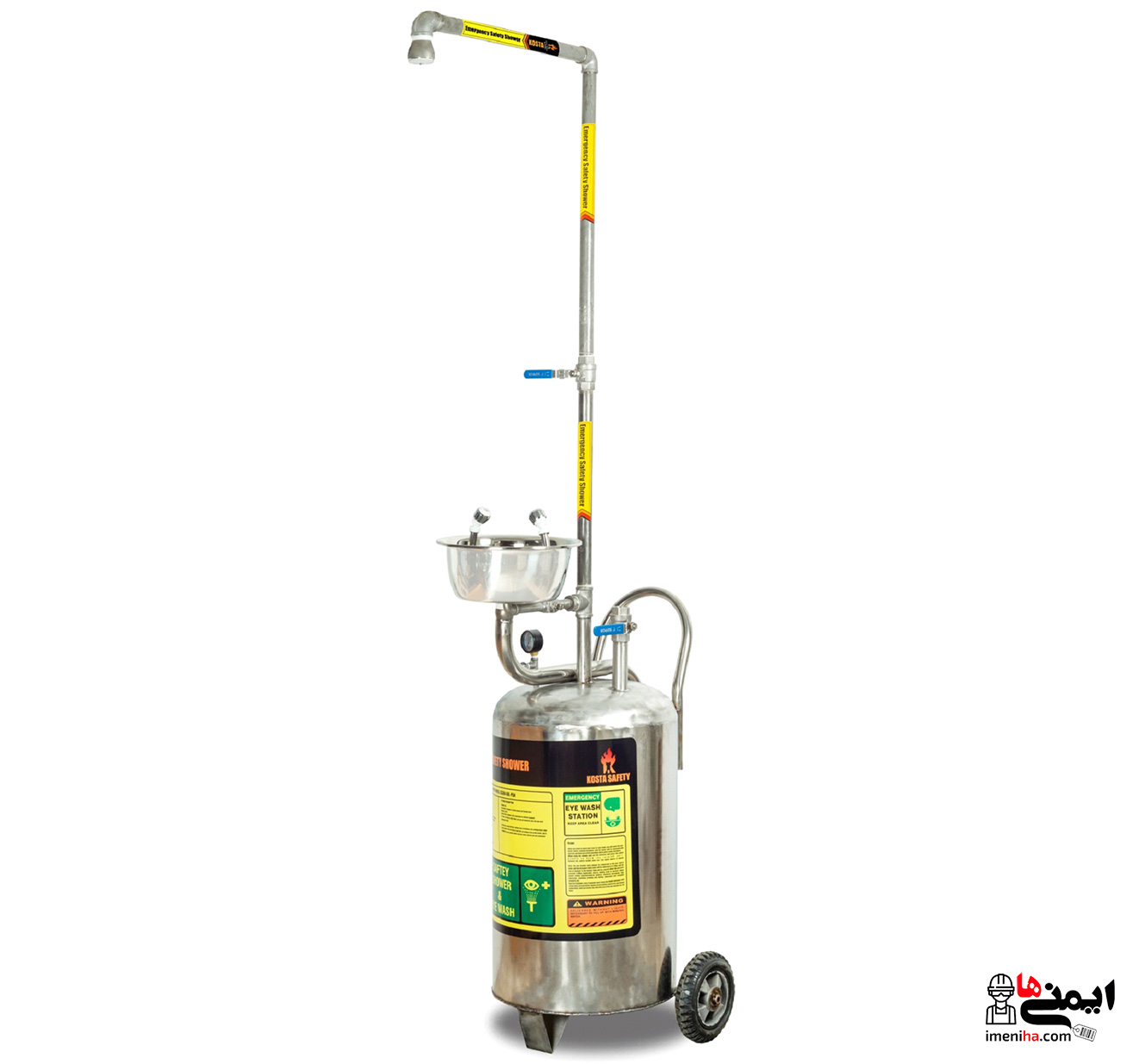 دوش و چشم شوی قابل حمل SS304-68L-PSH مخزن دار | شیردوش اضطراری استیل دوتیکه | سردوش استیل 1 اینچ با نازل پلی اتیلن | فاضلاب شوی استیل