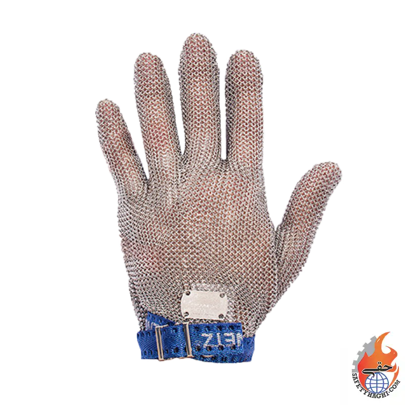 فروش دستکش ضدبرش فلزی زنجیری ساق کوتاه MG2152 دارای استاندارد اروپا. رنگ نقره ای با نوار آبی. جنس فلز ضدبرش و سبک، انعطاف پذیر و ضد زنگ