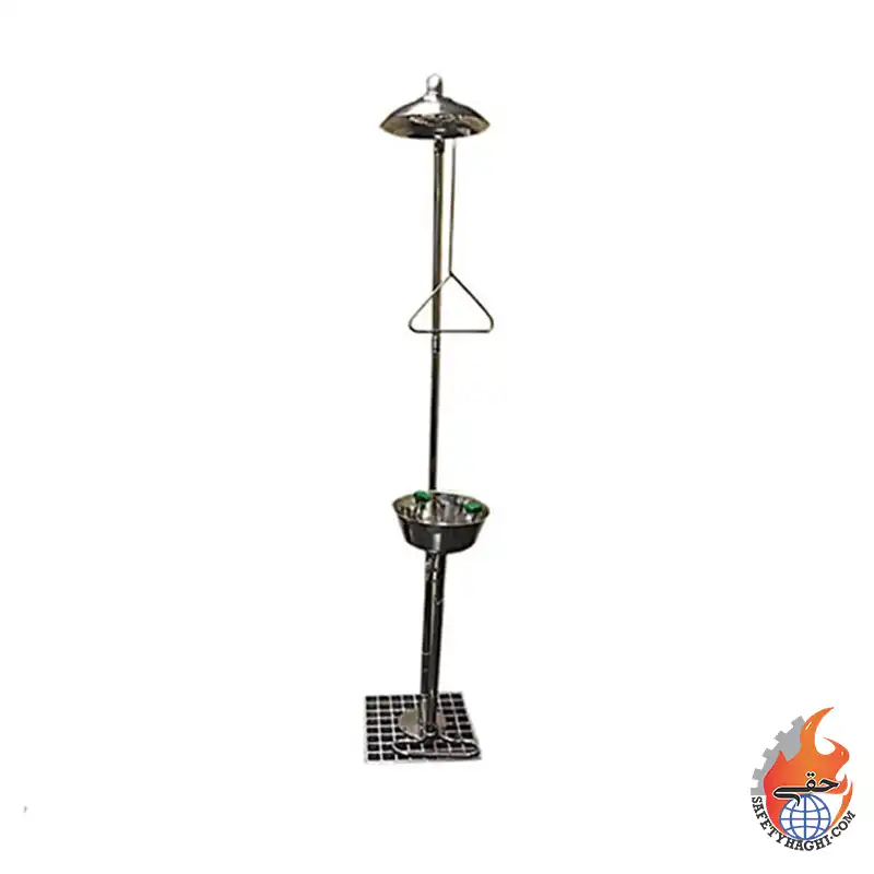دوش و چشم شوی اضطراری استیل نیم پدالی | شست و شوی سریع چشم و بدن و البسه ی آغشته به مواد شیمیایی | فاضلاب درون ریز